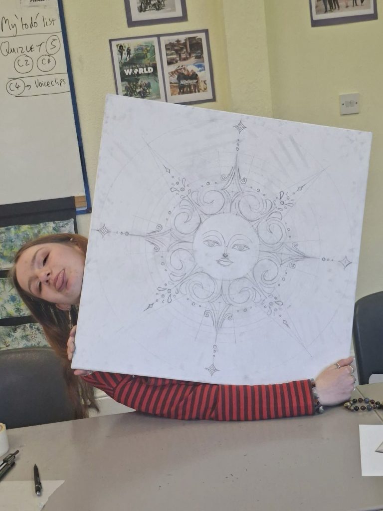 We did not have to be at school before 11 am which was very nice because it was a holiday after all. We arrived and separated into groups of 11, which was a lot because we had to be eye to eye witch whether we wanted to give our best in the competition or just have fun. But luckily, we all just wanted to have fun. We had to do different projects like for example build a wooden model, paint a mandala or finish a puzzle. Then there were other activities like chess or volleyball competitions. We also had the opportunity to go on one of two city trips, however there weren’t enough spaces for everybody to go on one which I think is quite unfair. Apart from that, there was this one girl who wanted to go on both the trips and somehow the teaches allowed her to even though others weren’t allowed to go on even one. I just think it is a bit disrespectful. Soraya and I decided to do the mandala and help with the model. The same girl that went on both trips decided which model we were going to do which would have been okey if she would have helped building it what she did not do. Anyways, I really enjoyed sketching the mandala on the canvas and was really looking forward to painting it.